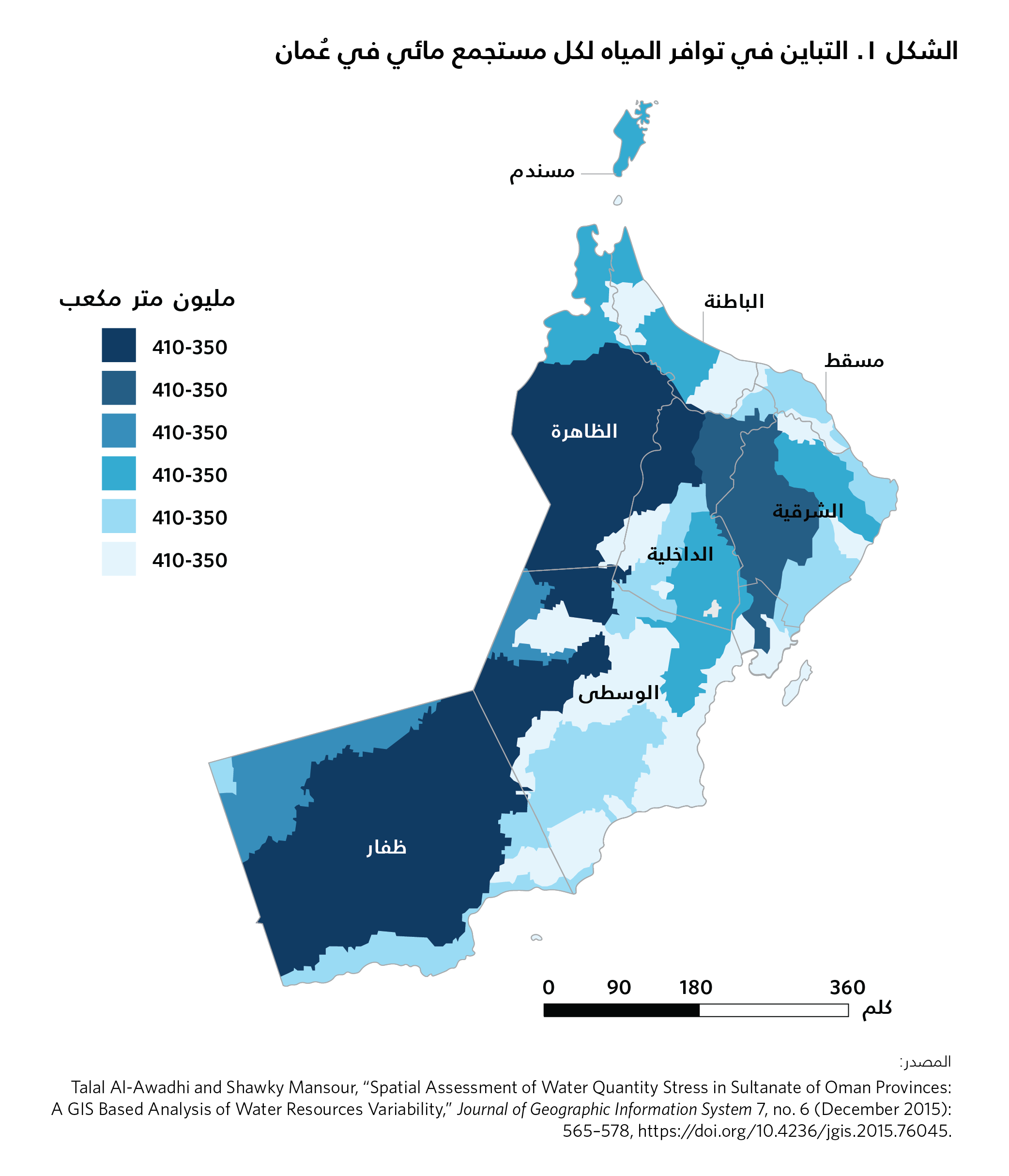 سلطنة عُمان معرَّضة بوجه خاص لهذه المخاطر المناخية نظرًا إلى عوامل عدّة. في الواقع، تفتقر مناطق واسعة في البلاد إلى الموارد المائية؛ ففي أجزاء من الشمال، لا يمكن الحصول على المياه إلا من القنوات المائية التقليدية التي هي من صنع الإنسان، والمعروفة بالأفلاج. وللبلاد أيضًا موارد محدودة من المياه العذبة، لذا تُعدّ المياه الجوفية مصدرها الأساسي للريّ والمياه العذبة. وتشكّل نُظم كثيرة للمياه الجوفية – بما في ذلك طبقات المياه الجوفية الكربونية في شمال ووسط جبال الحجر، وطبقات المياه الجوفية من الحجر الرملي في الجبال الشرقية والجنوبية، وطبقات المياه الجوفية الرسوبية في السهول والوديان الساحلية – مصادر مائية أساسية لعُمان، ما يوفّر المياه الجوفية للاستخدامات المنزلية والزراعية والصناعية. المؤسف أن الطلب المتزايد على المياه الجوفية، مقرونًا بتبعات تغيّر المناخ، يحفّز عوامل مثل الاستهلاك الواسع، والملوحة، والتلوّث، التي تهدّد طبقات المياه الجوفية الحيوية في البلاد. وقد أثار ذلك مخاوف كبيرة بشأن الطرق التي سيتسبّب بها تغيّر المناخ باشتداد التداعيات على المياه الجوفية. يُظهر الشكل 1 التباين في توافر المياه لكلّ مستجمع مائي في عُمان.