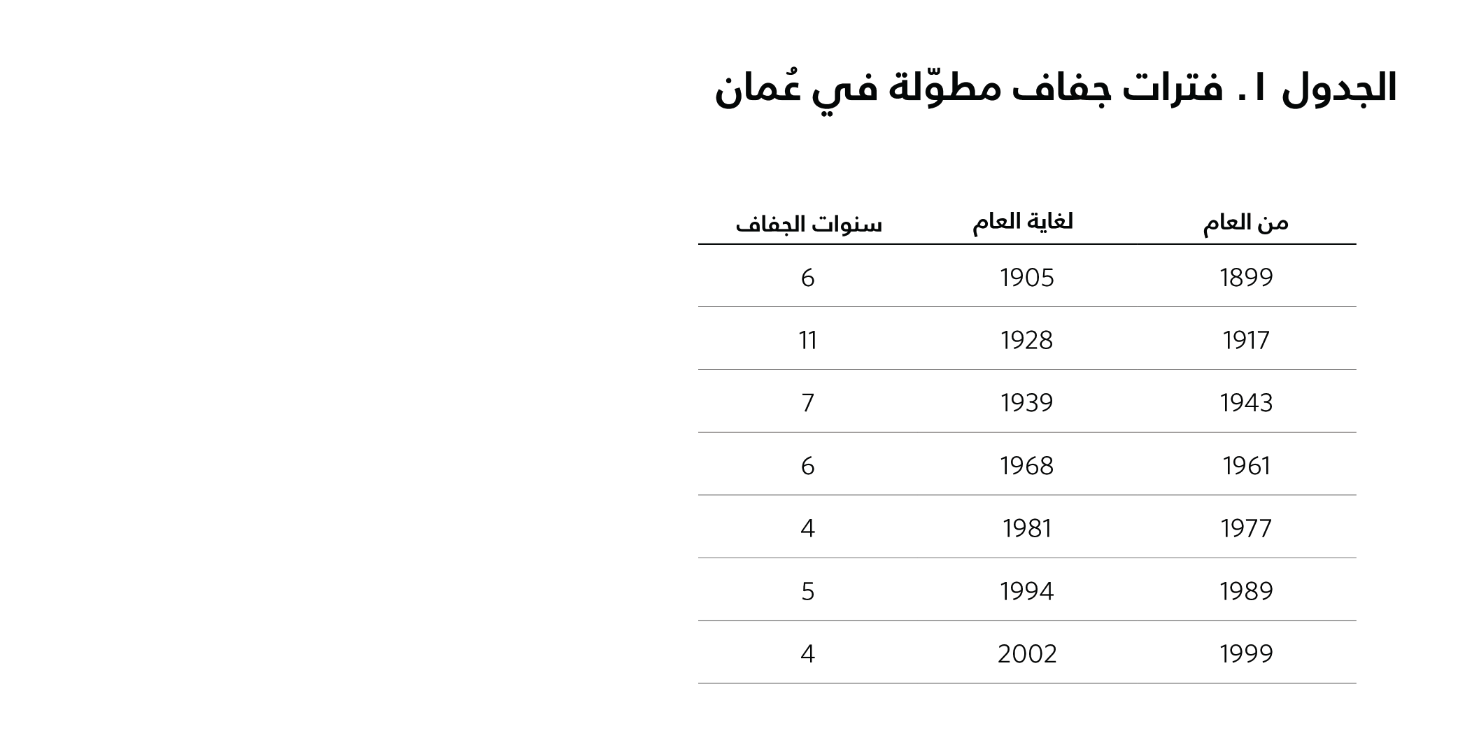 تبعًا لذلك، يمكن أن يؤدّي تغيّر المناخ إلى تبدّل أنماط المتساقطات، ما يؤثّر في كميات الأمطار وغزارتها وتوزّعها في عُمان. ويؤدّي تراجع كمية المتساقطات أو التغييرات في أنماط هطول الأمطار إلى انخفاض تغذية المياه الجوفية وتفاقم مشكلات ندرة المياه، ما يؤثّر في معدّلات تغذية المياه الجوفية وتجديد طبقات المياه الجوفية. وتُظهر السجلات أنه سبق لسلطنة عُمان أن شهدت عددًا من مواسم الجفاف المطوّلة (انظر الجدول 1).