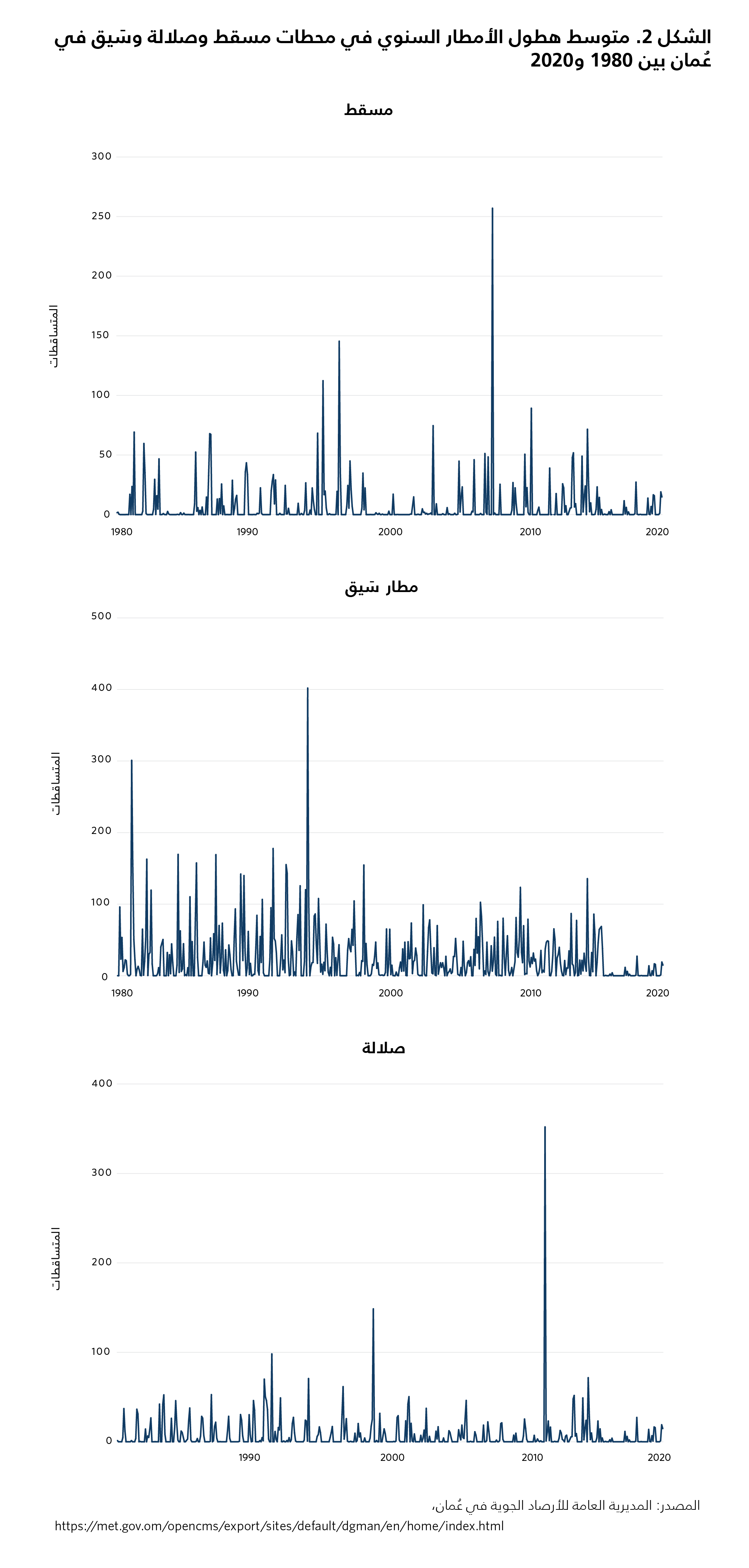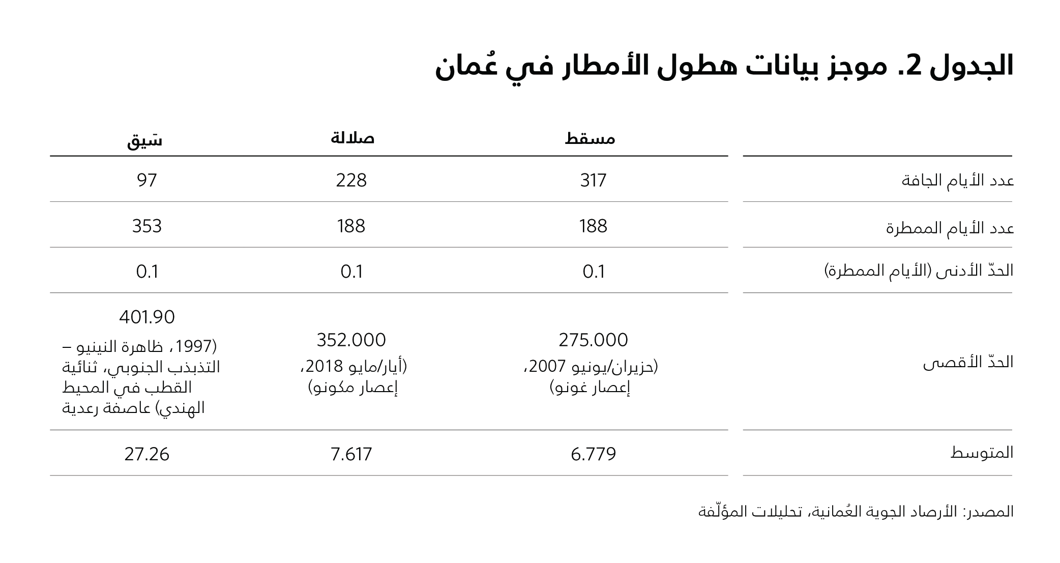 هطول الأمطار في سلطنة عُمان غير مستقر ومحدود جدًّا، وبعض السنوات تتخلّلها فترات تشهد تساقط الأمطار بغزارة. يُظهر الشكل 2 الاختلاف في معدّلات الأمطار في ثلاث محطات مختلفة في عُمان (مسقط، وسَيق في جبال الحجر الشرقية، وصلالة في جنوب البلاد). ويوجز الجدول 2 بيانات هطول الأمطار من المحطات المختلفة الثلاث نفسها بين العامَين 1980 و2020.