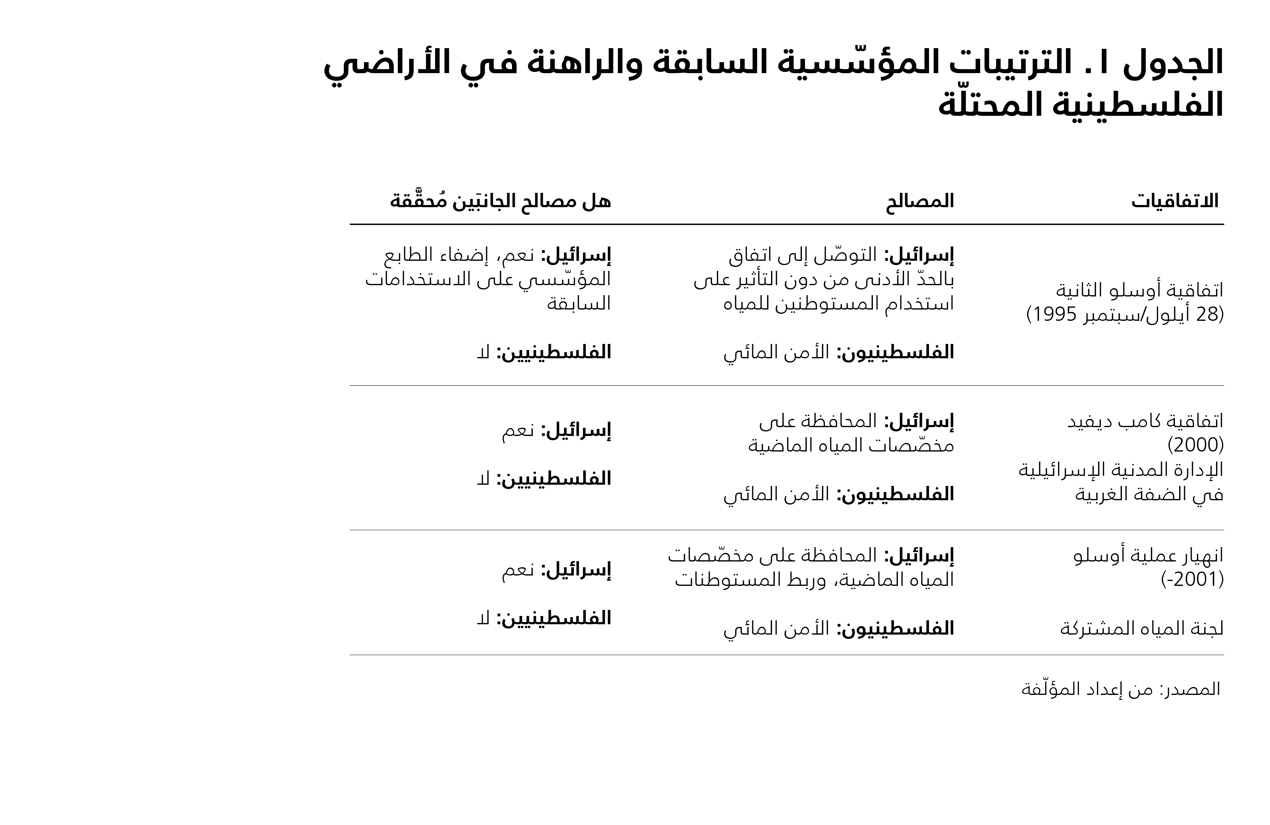 يُظهر الجدول 1 الترتيبات المؤسّسية التي تَفاوض بشأنها الجانبان الفلسطيني والإسرائيلي منذ عملية أوسلو للسلام، كاشفًا عن أنماط الهيمنة ومصالح كلٍّ من الطرفَين.