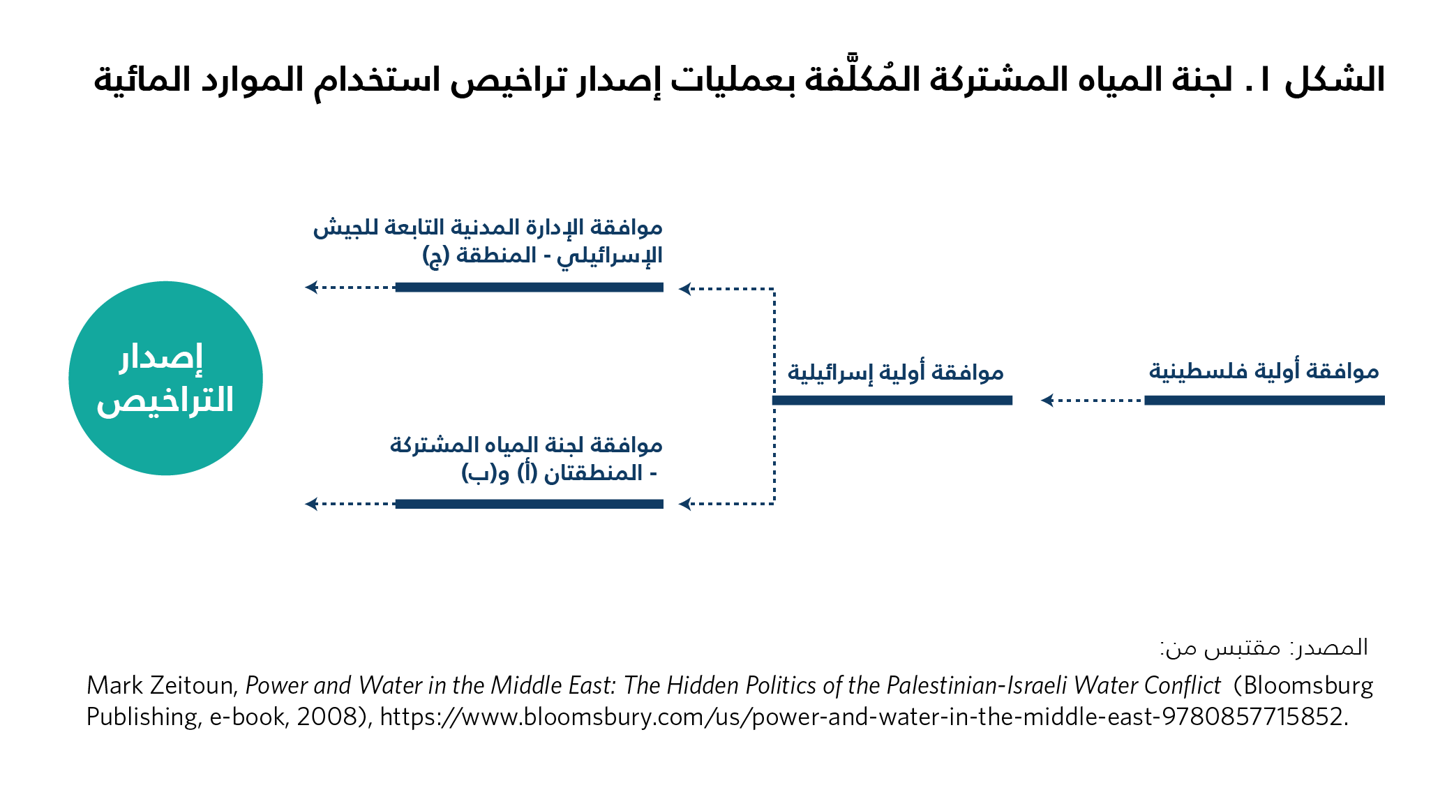 في أواخر تسعينيات القرن الماضي، أصبحت الاجتماعات بين القادة الإسرائيليين والفلسطينيين غير منتظمة، وتحوّلت اللجان المشتركة إلى منصّات لتبادل الاتهامات بارتكاب انتهاكات. وبينما أُشير رسميًا إلى عملية صنع القرار على أنها متساوية ومتبادلة، نظرًا إلى أن القرارات تتطلّب توافقًا، احتفظت إسرائيل باستخدام حقّ النقض ضدّ أيّ طلب يتقدّم به الفلسطينيون لإطلاق مشاريع جديدة، بما في ذلك في المنطقتَين (أ) و(ب) من الضفة الغربية. في المقابل، لم يكن لدى الفلسطينيين أيّ وسيلة للاعتراض على المشاريع الإسرائيلية أُحادية الجانب، مع أن السلطة الفلسطينية تتمتّع بدرجات مختلفة من الحكم الذاتي في هاتَين المنطقتَين. وقد منع حقّ النقض هذا الفلسطينيين من الحصول على موارد مائية إضافية، وبناء محطّات لمعالجة المياه العادمة في الضفة الغربية. أما أيّ مشروع مياه جديد يتقدّم به الفلسطينيون في المنطقة (ج)، فيستدعي بموجب اتفاقية أوسلو الثانية موافقة هيئةٍ إسرائيليةٍ بالكامل ضمن لجنة المياه المشتركة، وهي الإدارة المدنية الإسرائيلية التي تمثّل الفرع المدني للجيش الإسرائيلي وتُشرف عليها وزارة الدفاع. تضمّ الإدارة المدنية الإسرائيلية ثلاث عشرة لجنة فرعية، تتألّف بدورها من ممثّلين عن المستوطنات اليهودية (أنظر الشكل 1 أعلاه)، التي تُعَدّ جميعها غير شرعية بموجب القانون الدولي. يُذكَر أن منظمة حقوق الإنسان الإسرائيلية "بتسيلم" تُقدِّر عدد المستوطنين اليهود في الضفة الغربية بما يزيد عن 413 ألف مستوطن، إضافةً إلى حوالى 200 ألف مستوطن في القدس الشرقية.