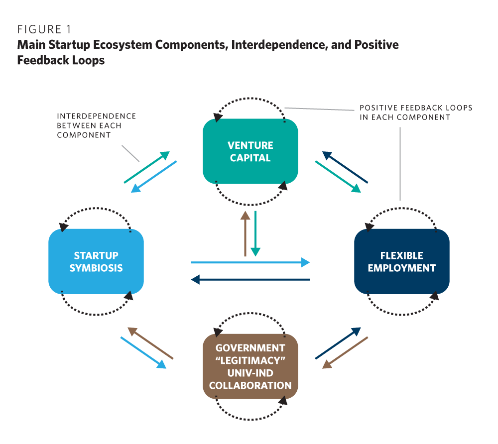 At the base of every discussion about startup ecosystems needs to be a conception of what their main components are, and how these components fit together. The conception here, based on the Silicon Valley model, involves several main components that depend upon one another, as each component develops over time to experience the positive feedback loops of development that are needed for the component to become self-sustaining.