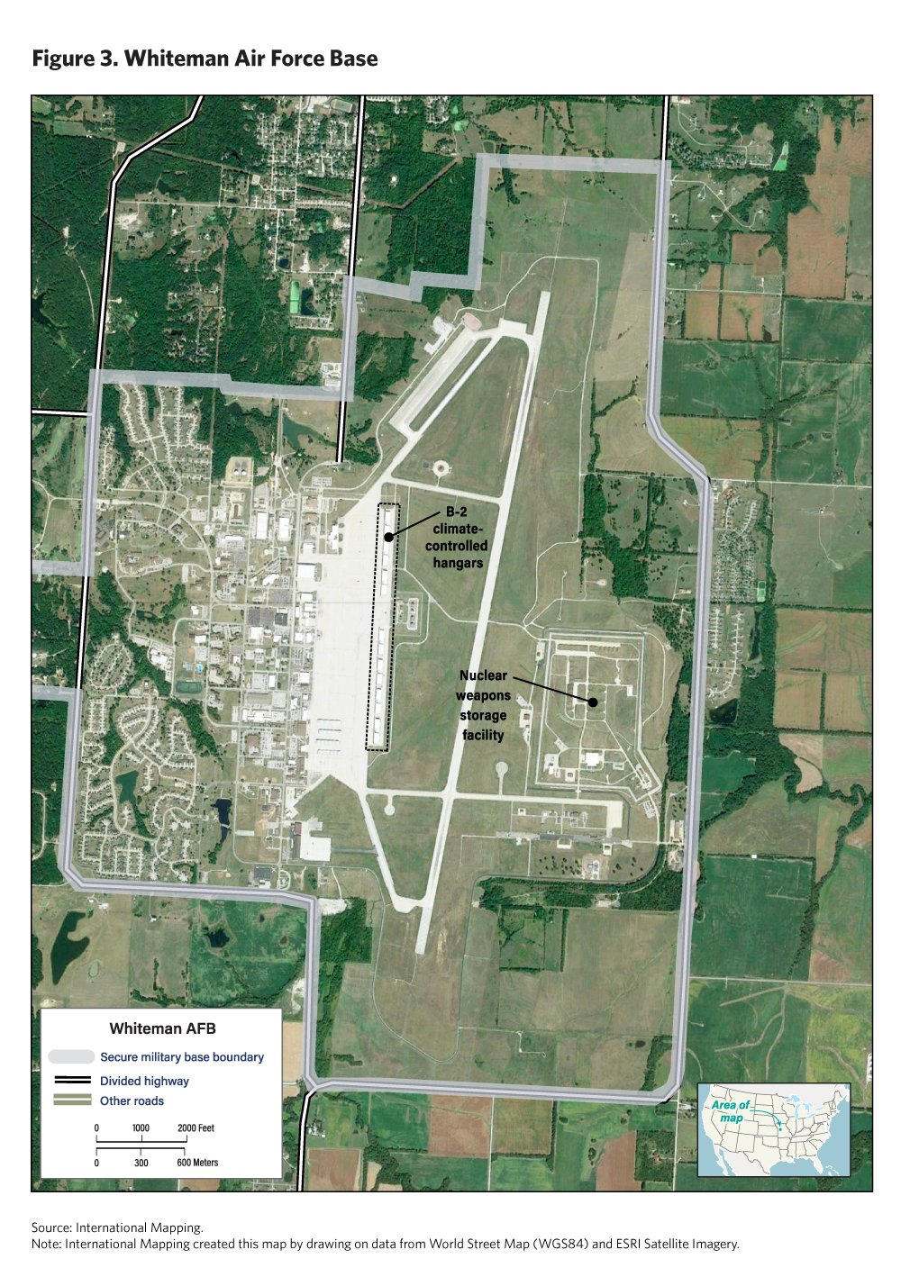Located in Johnson County, Missouri, about 70 miles east of Kansas City, Whiteman Air Force Base is home to the United States’ only stealth nuclear bombers—the B-2 Spirit. As the only operational base for the nation’s twenty B-2s,89 Whiteman is tasked with maintaining, supporting, and operating the bombers.90 The planes are stored on base in special climate-controlled hangars, in part due to the sensitivity of their radar-absorbent skin.91 As indicated in figure 3, these hangars are located near the base’s weapons storage facility, which houses an estimated 100 nuclear gravity bombs that stand ready to be loaded onto the B-2s.92